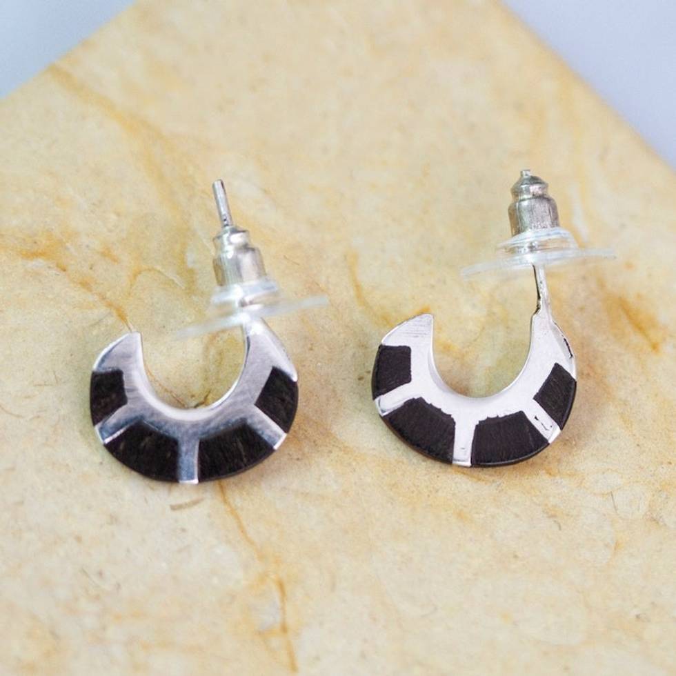 Wood-Accented Sterling Silver Half-Hoop Earrings from Mexico 'Dapper Caress' Item ID: 2671807612