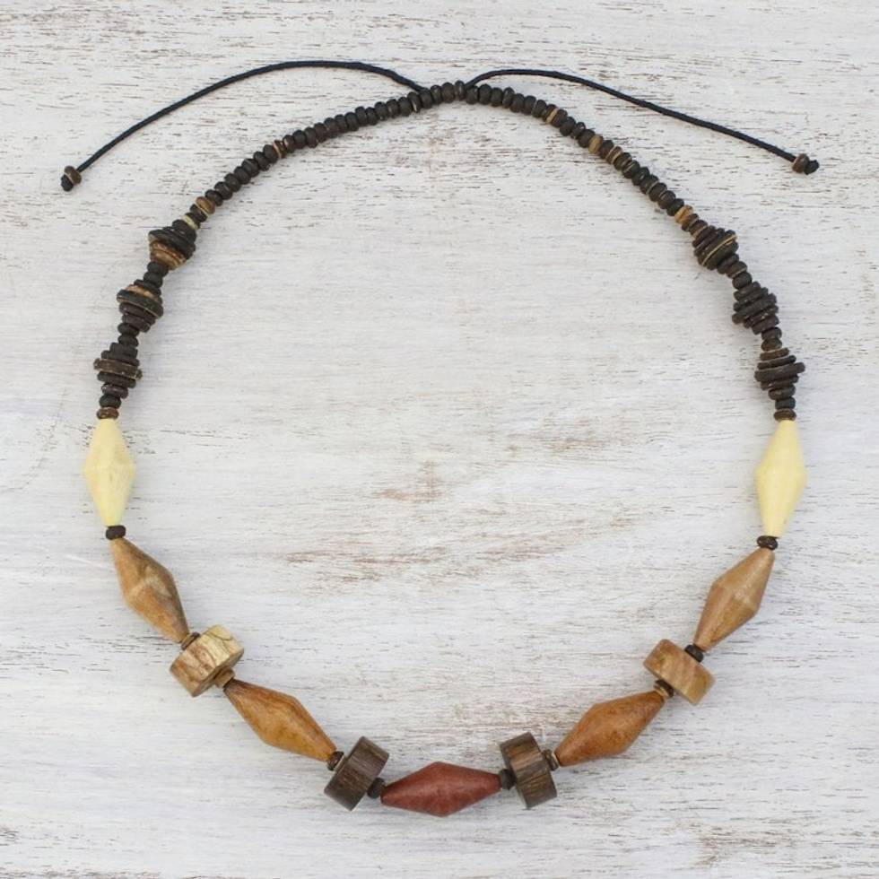 Wood and Coconut Shell Long Bead Necklace from Thailand 'Summer Traveler' Item ID: 2671800643