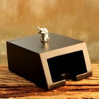"Jaifah Aksornsri designs a whimsical business card holder with an elephant figurine on the top. Sculpted of pewter, the elephant stands on a rain tree wood holder with an external slit for card display. The dark brown box can hold approximately 80 business cards of standard size."