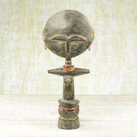 "Emerging from a pot, the figure of a woman with outstretched arms is crafted of Ghanaian sese wood, featuring a charming, antiqued finish. With a characteristically exaggerated head, this fertility doll represents an African tradition as they are often given to women who are hoping to conceive. Hand-carved by Winfred Korley, the sculpture wears beaded jewelry of colorful recycled glass."