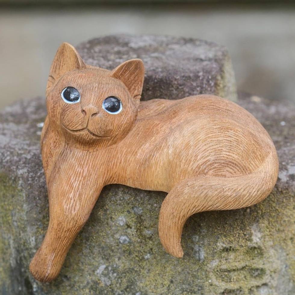 Wood Cat Sculpture Hand Carved in Indonesia 'Watchful Long Haired Cat' Item ID: 2671476892