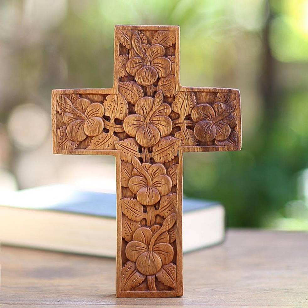 Wood Cross Sculpture with Hand Carved Hibiscus Flowers 'Hibiscus' Item ID: 2671821112