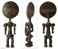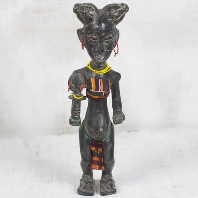 "Tall and graceful, this woman embraces her beautiful twin girls. Winfred Korley carves a fertility doll with beaded jewelry and a kente cloth breech clout. Among the Akan people, such dolls are presented to women who have given birth to twins, highly respected in their communities."