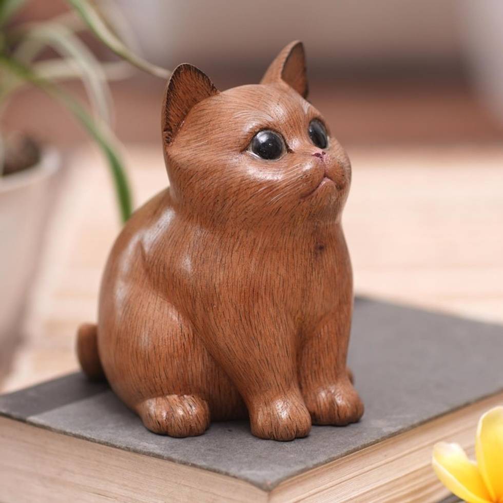Wood Figurine of Adorable Cat Hand-Carved in Bali 'Cozy Cat' Item ID: 2669909463