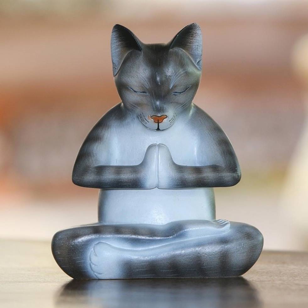 Wood Meditating Cat Sculpture in Grey and White from Bali 'Meditating Kitty in Grey' Item ID: 2671733806