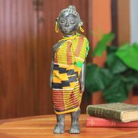 "Beautifully coiffed, a young woman is regally dressed. She is draped in Africa's legendary handwoven kente cloth and wears beaded necklaces and earrings. Carved by hand from sese wood, this sculpture is named Akwajan, a Ga word denoting the Queen Mother's attire."