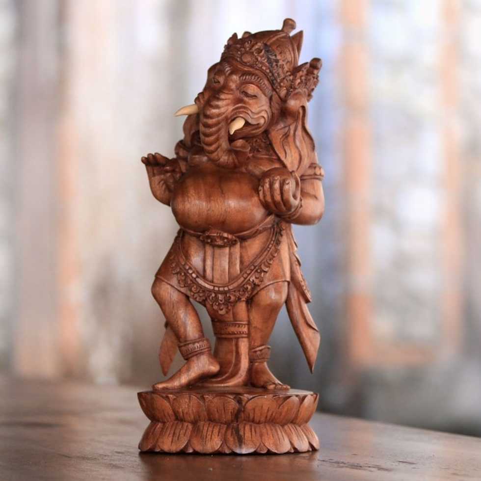 Wood Sculpture of Ganesha on a Lotus Flower from Bali 'Wonderful Ganesha' Item ID: 2669889444