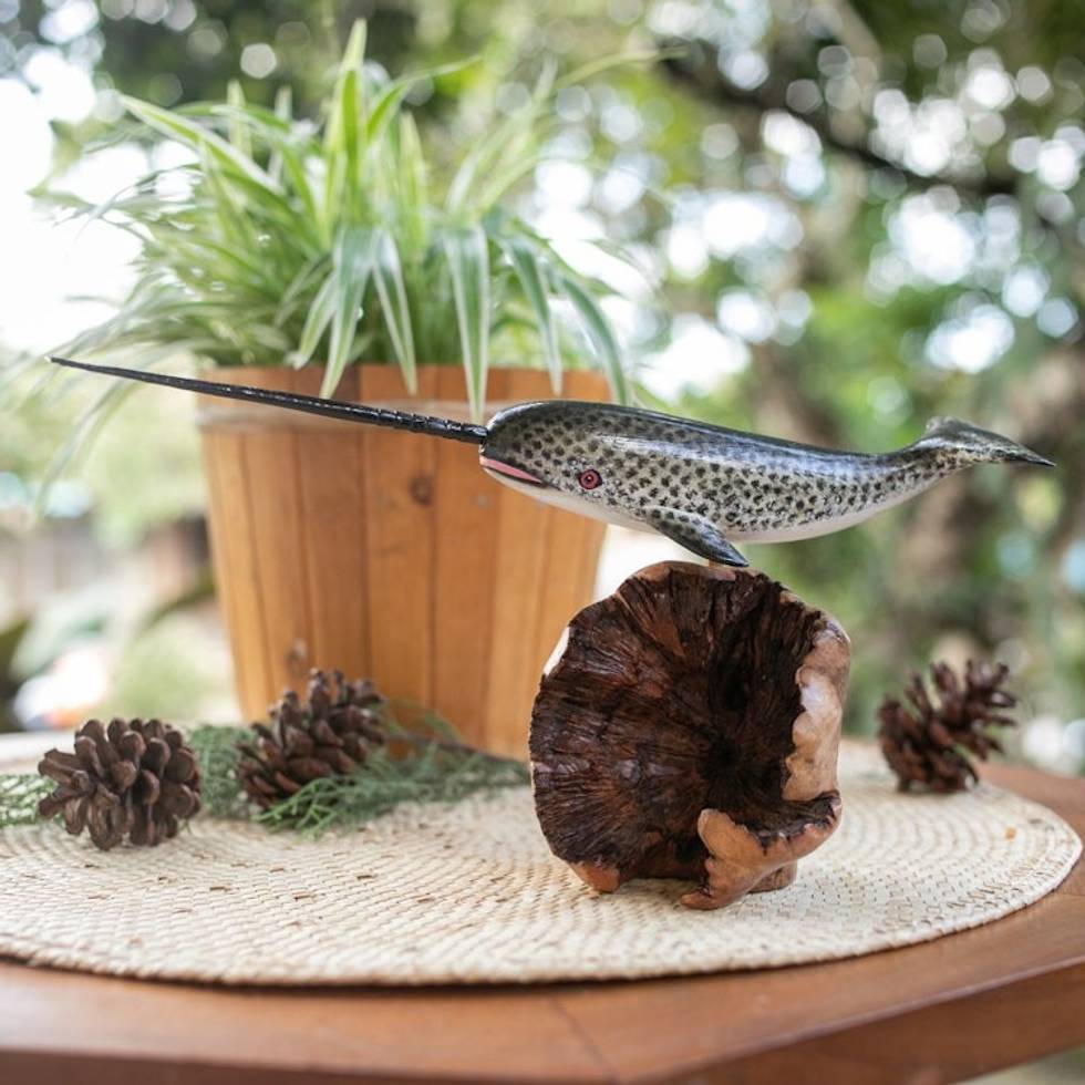 Wood Sculpture of Narwhal Whale with Mushroom-Shaped Base 'Narwhal Whale' Item ID: 2671765236