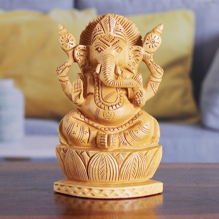 "The son of Shiva and Parvati, two of the most powerful deities in Hindu belief, Ganesha is the remover of all obstacles. He is invoked before any auspicious event. This beloved god with the head of an elephant appears in a kadam wood carving from Suresh and Devender Garg. The details are realistic and beautiful."