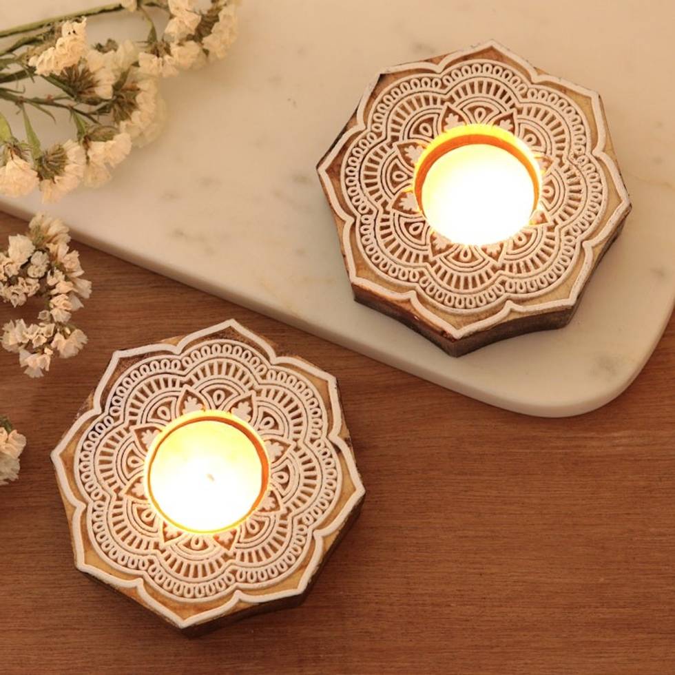 Wood Tealight Candle Holders with Floral Motif Pair 'Lotus Mandala' Item ID: 2669892151