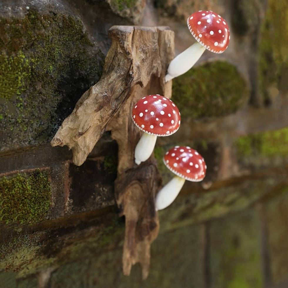 "If you're searching for a distinctive and charming accent to elevate your home decor, look no further than Bali's Made Arsa's exquisite wood wall art where gamal wood left in its natural state and shape is embellished with petite mushroom figurines carved from jempinis wood. Each mushroom is carefully hand-painted in its characteristic red and white color scheme, creating a whimsical and splendid aesthetic."