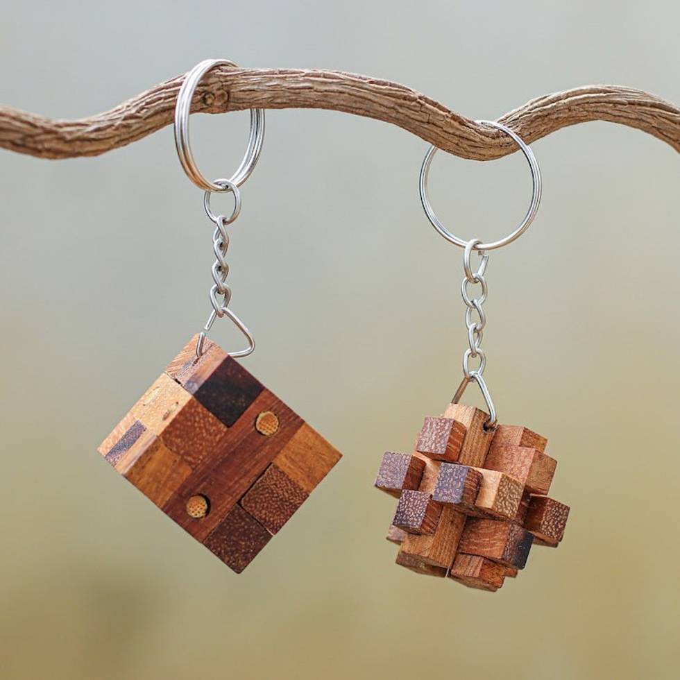 Wooden Puzzle Keyrings from Thailand Pair 'Nails and Squares' Item ID: 2671797611