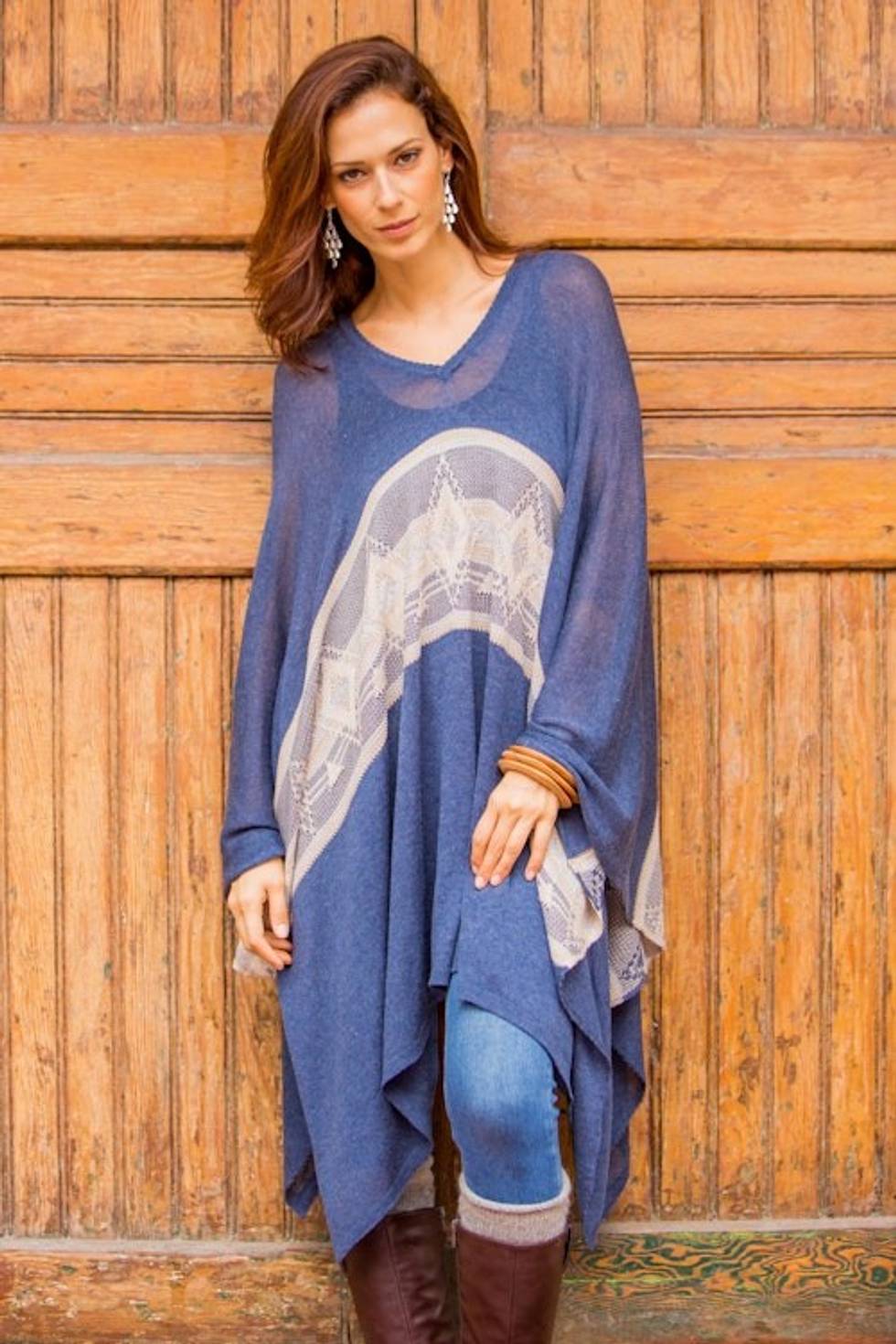 Woven Navy Blue Patterned Poncho from Peru 'Blue Inca' Item ID: 2670750735