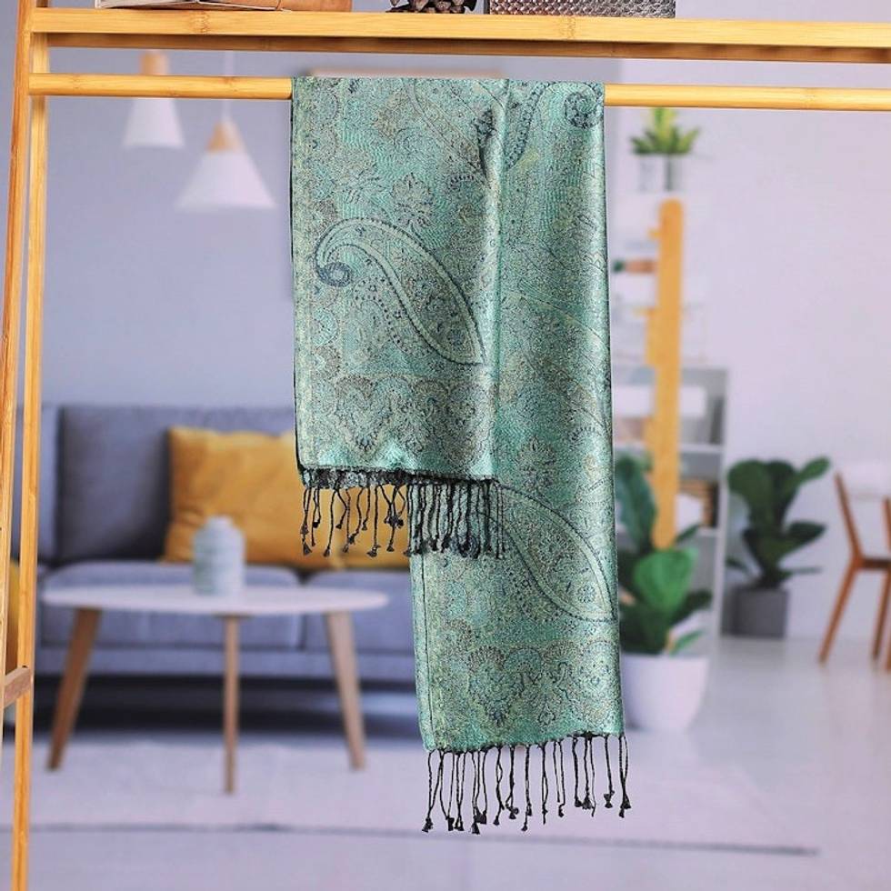Woven Reversible Jamawar Fringed Silk Scarf in Turquoise 'Magical Garden' Item ID: 2669924471