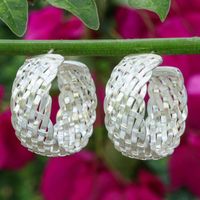 Woven-Textured Silver Half-Hoop Earrings from Thailand 'Woven Beauty' Item ID: 2676650945