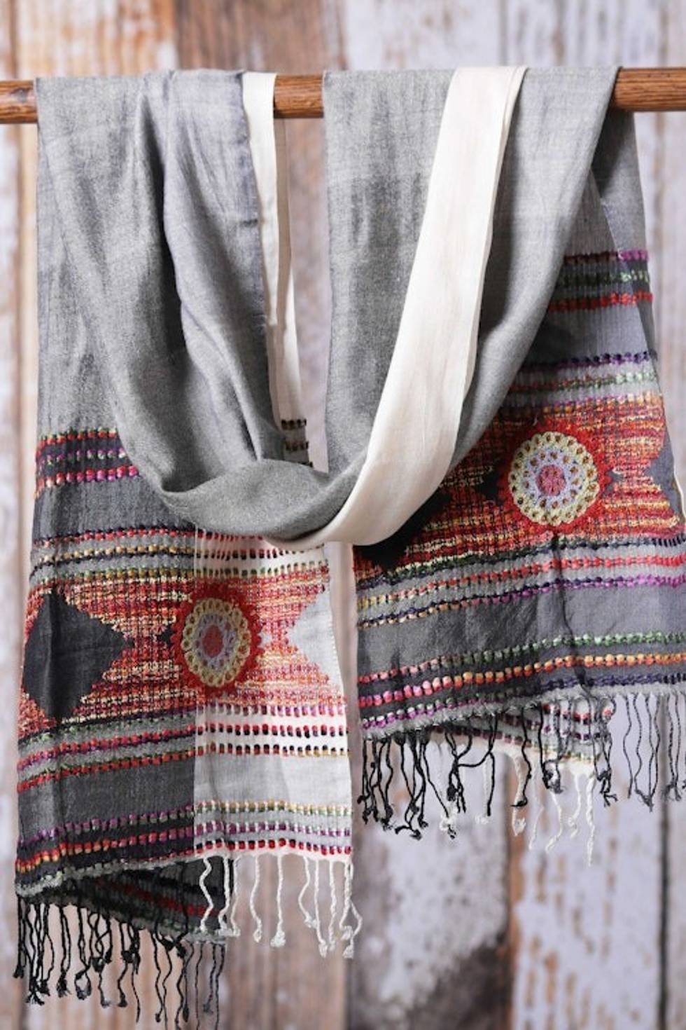Woven Viscose Scarf with Embroidery in Grey White and Red 'Timeless Splendor' Item ID: 2669943776