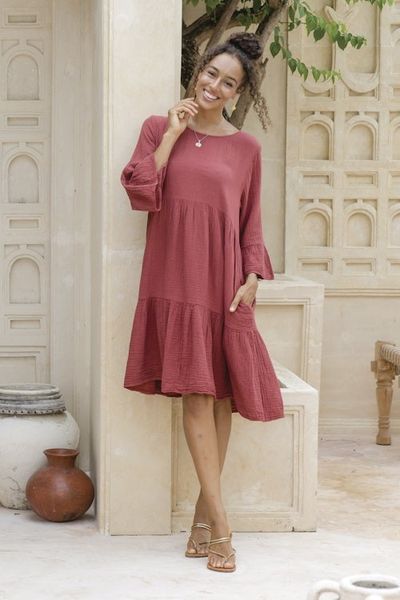 Embroidered Cotton A-Line Dress from India 'Petal Pink'