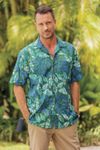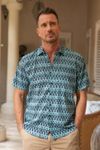 Men's Short-Sleeved Green Cotton Batik Shirt from Bali 'Green Leaf Shadows'